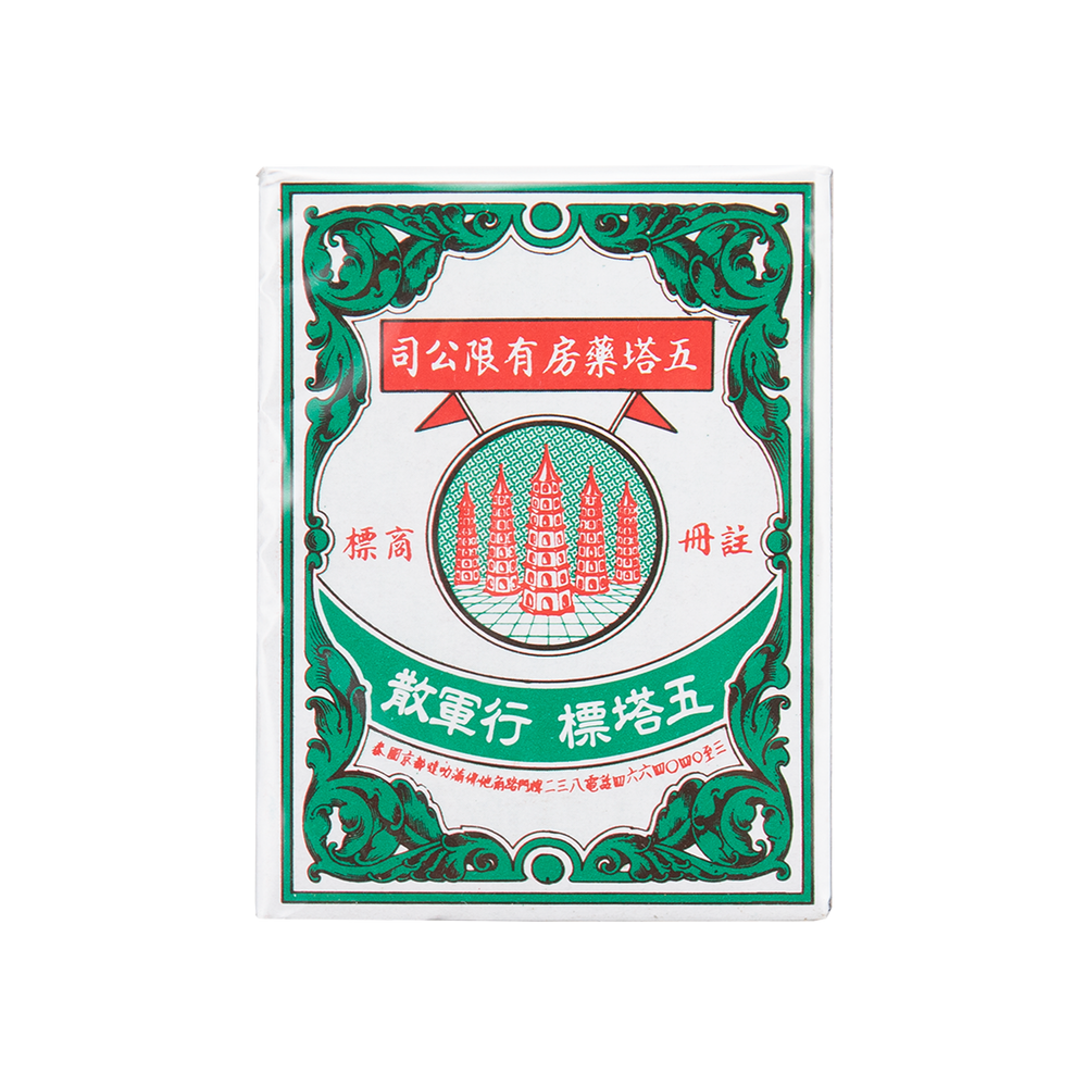 本藥品係選揀正地道薬料遵方精細硏製而成,此散之薬性溫和淸芬易服,適合用於下面所列各類病。而飲服之同時氣味芬馨,能避暑辟瘴提神醒腦,解除疲倦,實誠居家旅行應備藥品,也本薬品銷行全泰國、及香港、星加坡、檳城、馬來西亞、越南與南洋各地。深得用戶樂意介紹購用,尙希各界顧諸君購買時請認明五塔商標,庶免爲僞藥欺驕爲要。